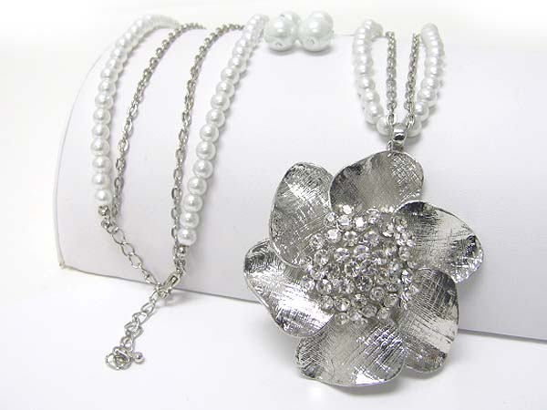 WHOLESALE CRYSTAL STUD SCRATCH META LFLOWER PENDANT PEARL AND METAL CHAIN LONG NECKLACE SET 353712