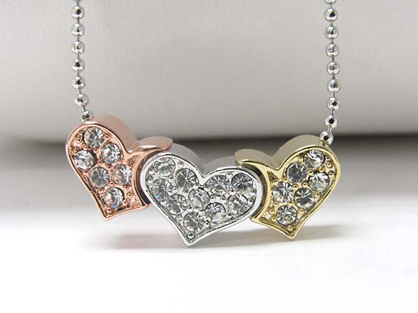 Made in korea whitegold plating crystal stud triple heart link necklace