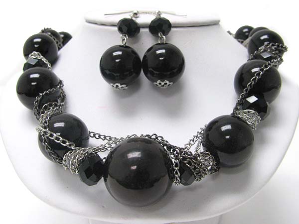 Pearl beads and facet glass chain tangle necklace earring set