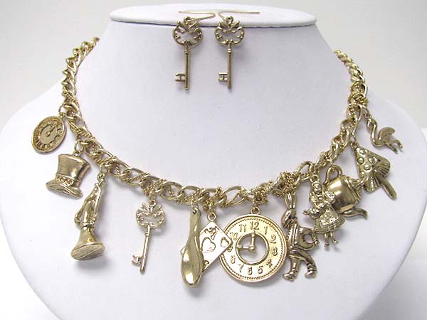 Alice in wonderland theme charm dangle necklace earring set