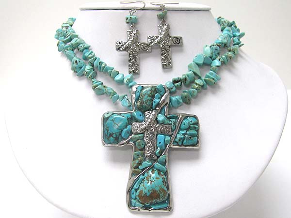 Multi strand mixed natural chip stone large cross pendant necklace set