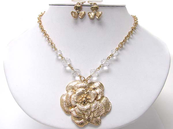 WHOLESALE SCRATCH METAL FLOWER PENDANT NECKLACE EARRING SET - BRASS METAL 354491