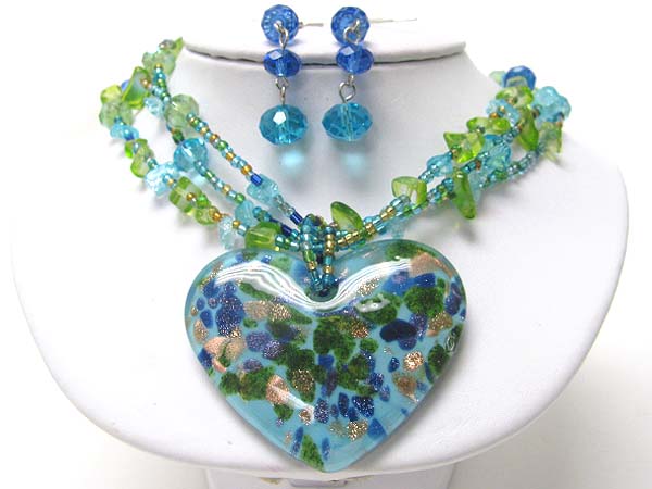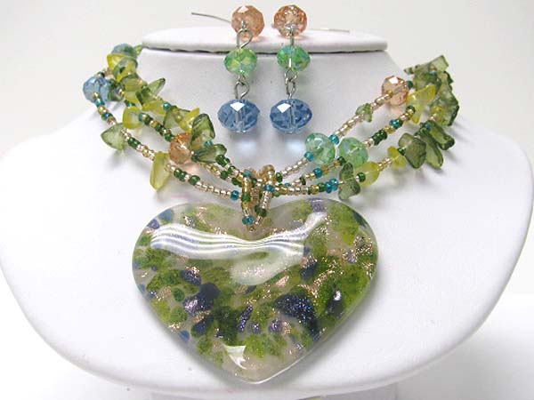 WHOLESALE MURANO GLASS HEART PENDANT AND MIXED CHIP STONE NECKLACE EARRING SET 354601