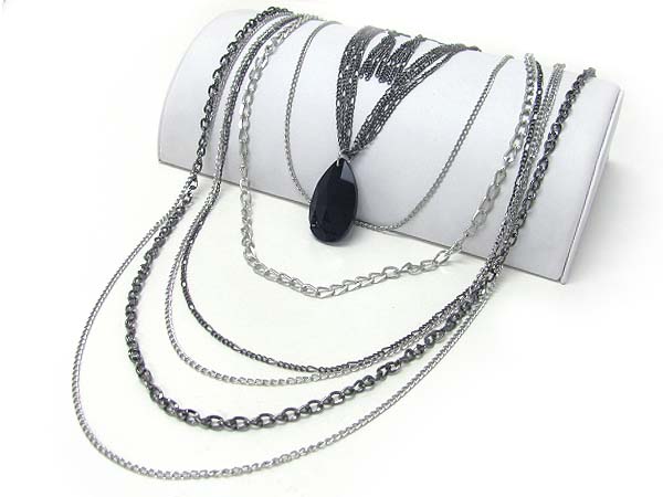 Galss tear drop and multi row mixed metal long chain necklace earring set