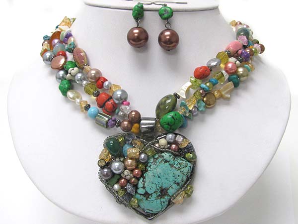 WHOLESALE TURQUOISE AND MULTI NATURAL STONE DECO CHUNKY HEART PENDANT AND MULTI STRAND NECKLACE EARRING SET 354977