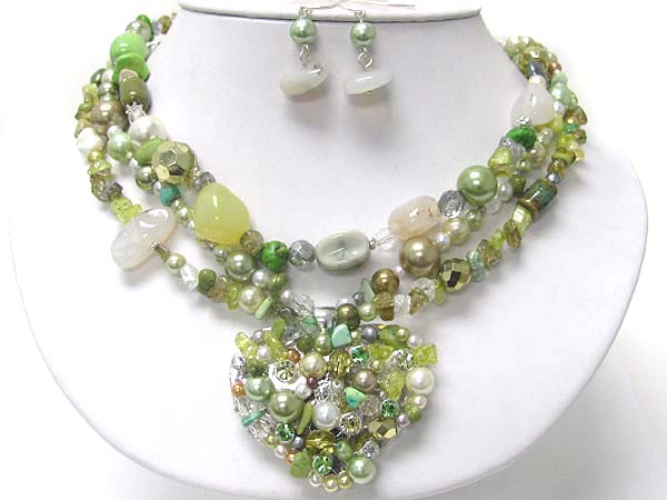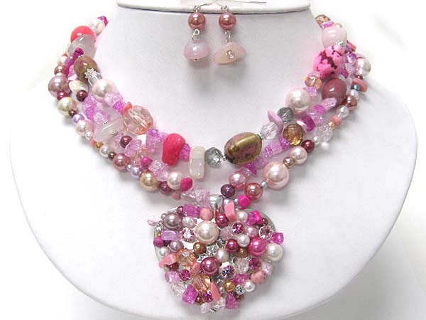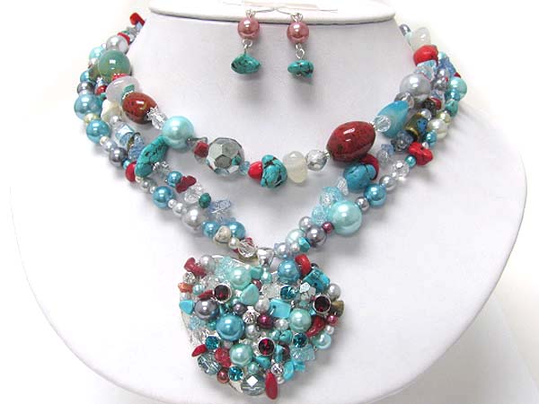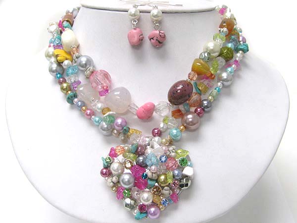 WHOLESALE MULTI NATURAL STONE AND PEARL DECO CHUNKY HEART PENDANT AND MULTI STRAND NECKLACE EARRING SET 354985