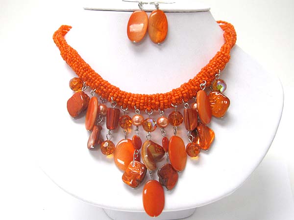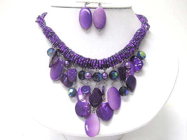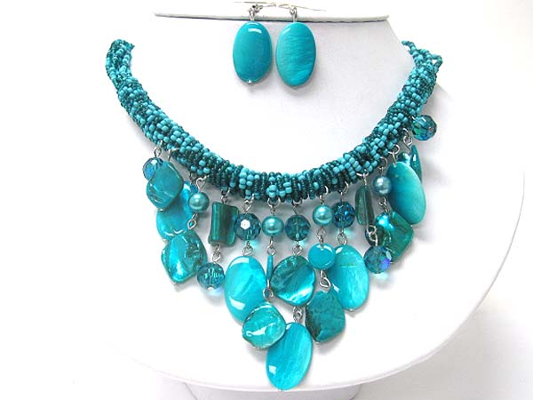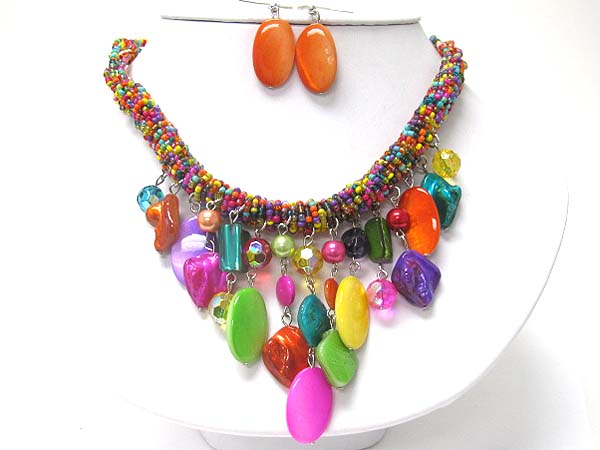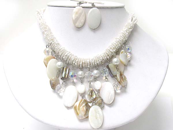 Multi sea shell disk dangle seed beads tube necklace earring set