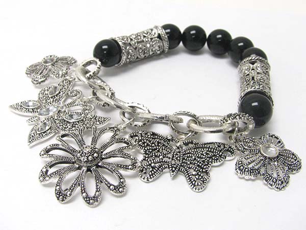 WHOLESALE MARCASITE LOOK TEXTURE MULTI BUTTERFLY AND FLOWER CHARM STRETCH BRACELET 355362