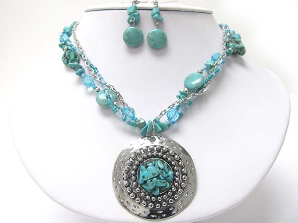Natural chips tone deco round pendant mixed beads necklace earring set