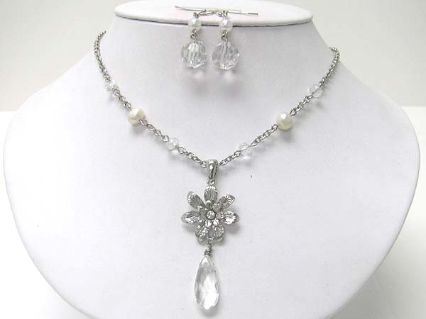 Crystal stud metal flower and tear drop pearl beads accent neckalce earring set