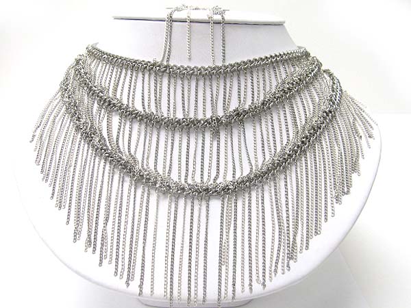 Triple layer metal tassel hanging drop necklace earring set