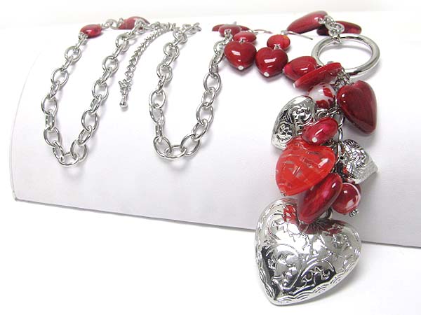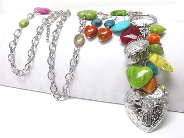 Ceramic and metal textured multi heart dangle long necklace earring set