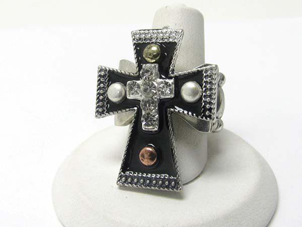 WHOLESALE MEDIEVAL DESIGN CRYSTAL AND PATINA METAL CROSS STRETCH RING 356011