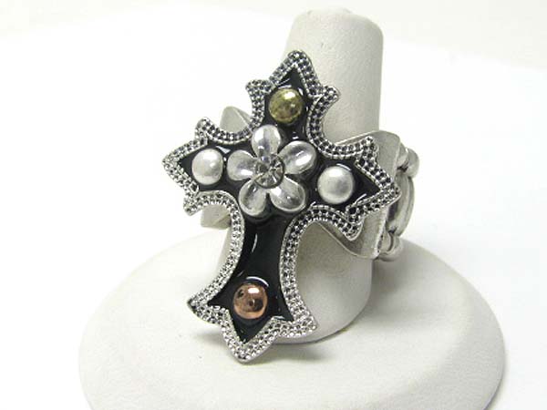 WHOLESALE MEDIEVAL DESIGN CRYSTAL AND PATINA METAL CROSS STRETCH RING 356019
