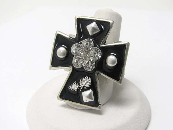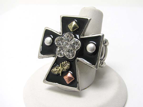 WHOLESALE MEDIEVAL DESIGN CRYSTAL AND PATINA METAL CROSS STRETCH RING 356029