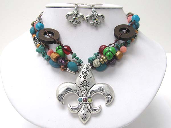 Mixed natueal stone fleur de lis pendant neckalce earring set