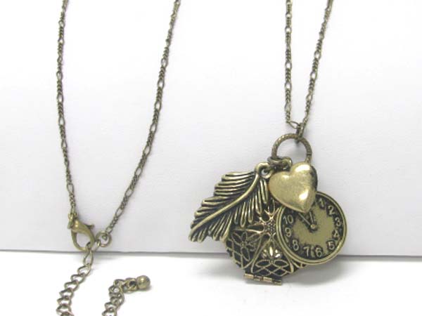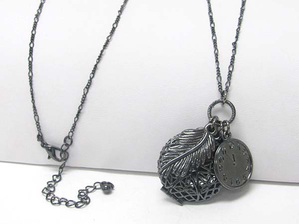 Antique look leaf and clock and round locket charm dangle long chain necklace
