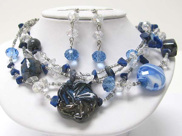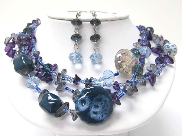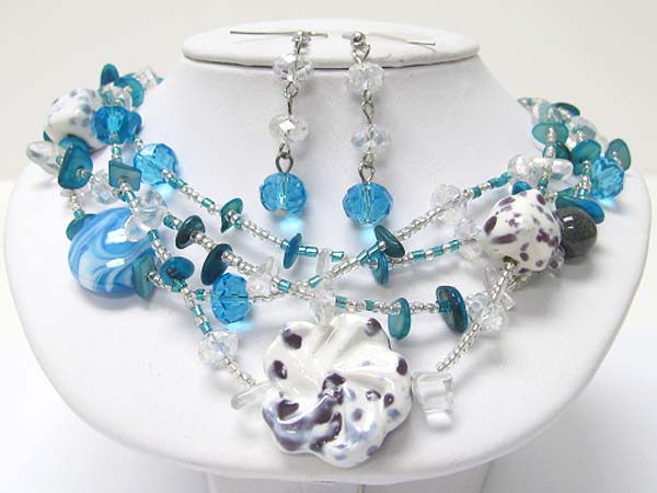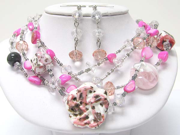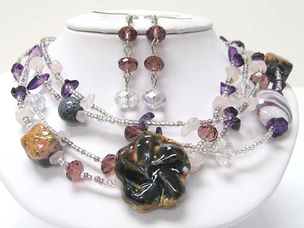WHOLESALE CERAMIC FLOWER AND MULTI ROW MIXED BEADS NECKLACE EARRING SET 356434