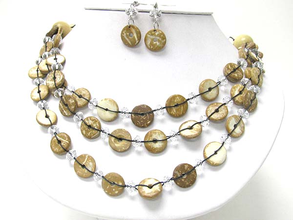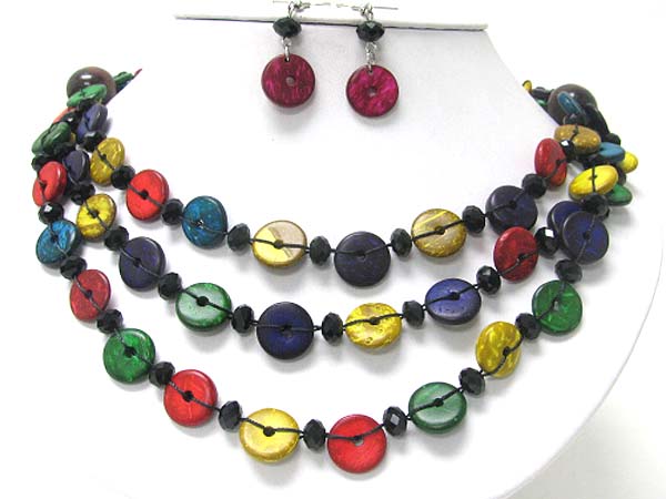WHOLESALE TRIPLE LAYER DYED GLOSSY SHELL DISK LINK NECKLACE EARRING SET 356478
