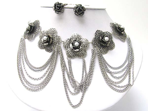 Pearl accent burnish metal flower and chain hanging drop necklace earring set