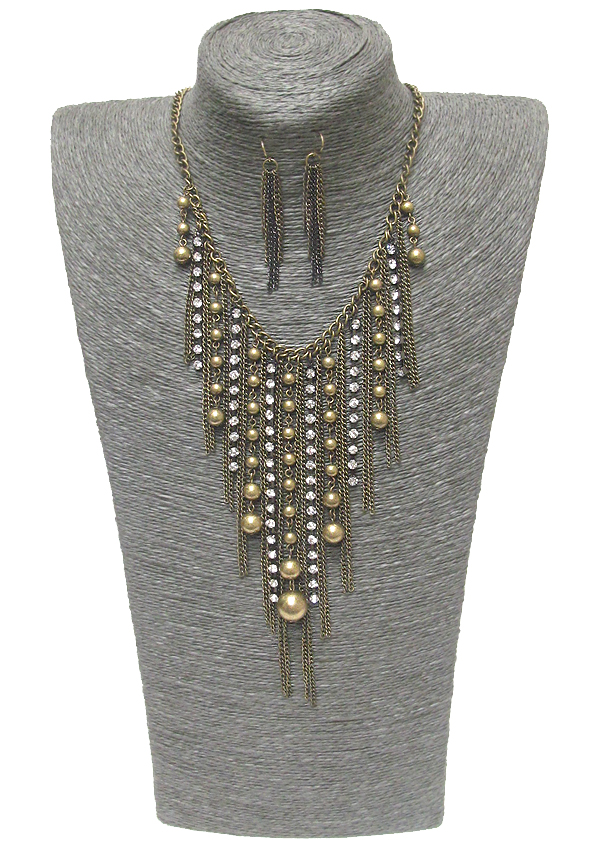 Multi rhinestone and metal ball and tassel drop necklace earring set