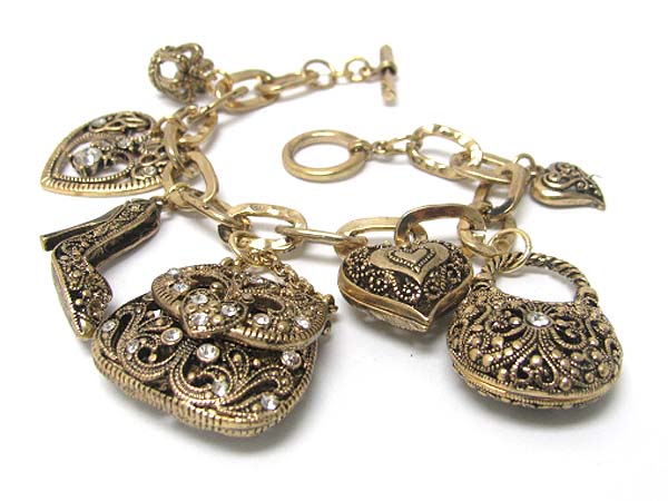 Crystal stud filfigree metal handbag and shoe charm dangle bracelet