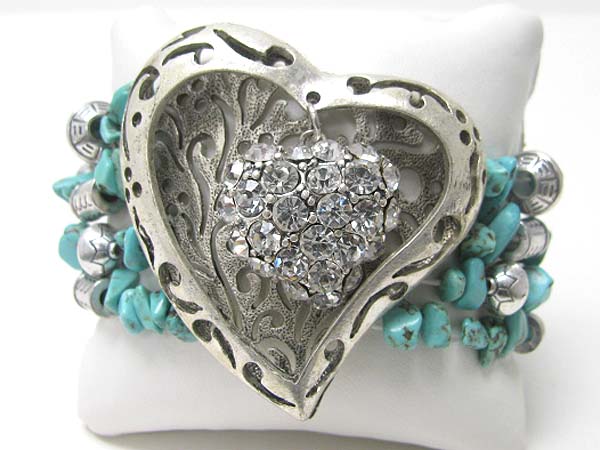 Crystal deco heart top natural chip stone stretch bracelet
