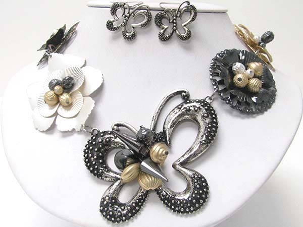 Natural chip stone deco metal butterfly and flower link necklace earring set