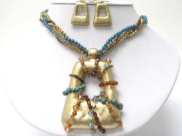 Large metal pendant with mixed stone and beads fusion deco neckalce earring set