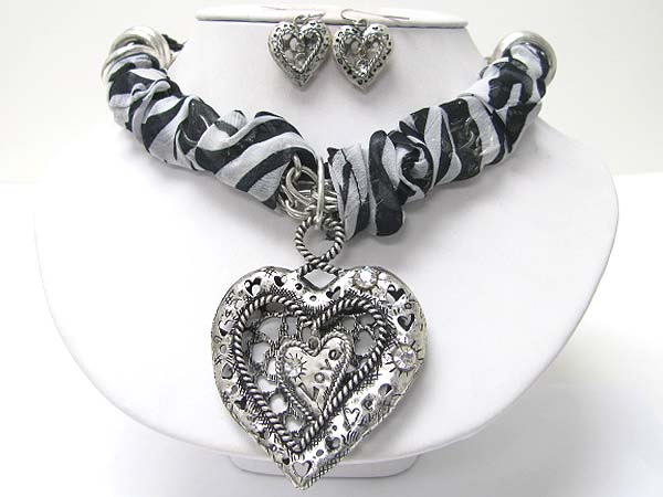 Crystal stud heart pendant and leopard pattern scarf wrapped necklace erarring set
