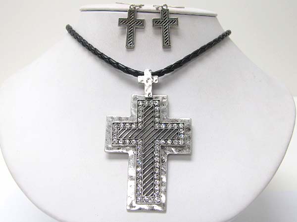Crystal stud burnish metal cross pendant necklace earring set