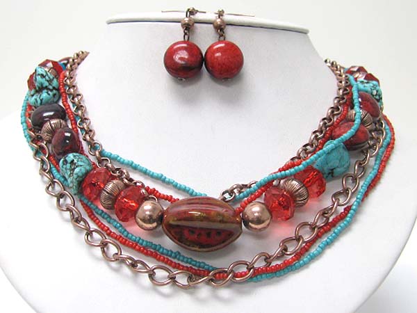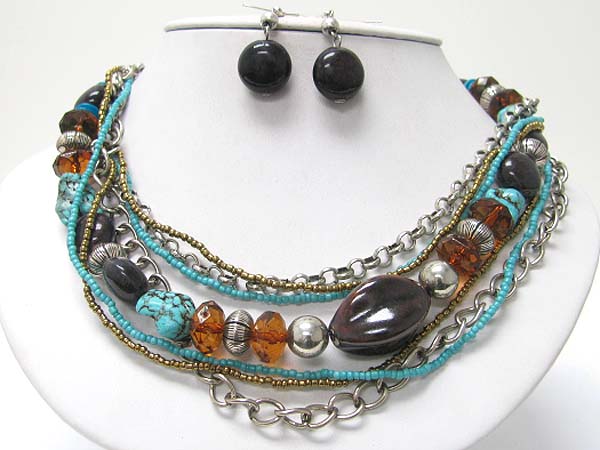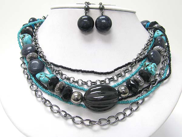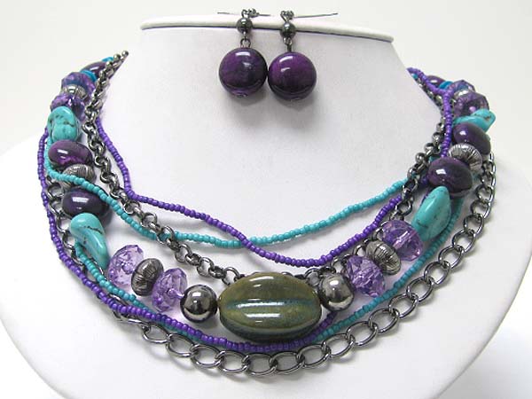 WHOLESALE MULTI STRAND MIXED STONE AND METAL CHAIN NECKALCE EARRING SET 358211