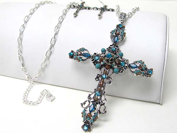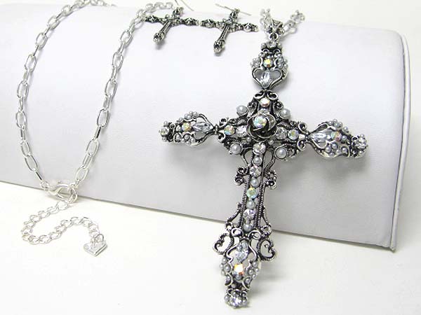 WHOLESALE CRYSTAL AND SEED BEADS DECO CROSS PENDANT NECKLACE EARRING SET 358614