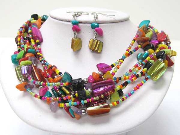 Braided multi row shell and seed beads mixed neklace earring set