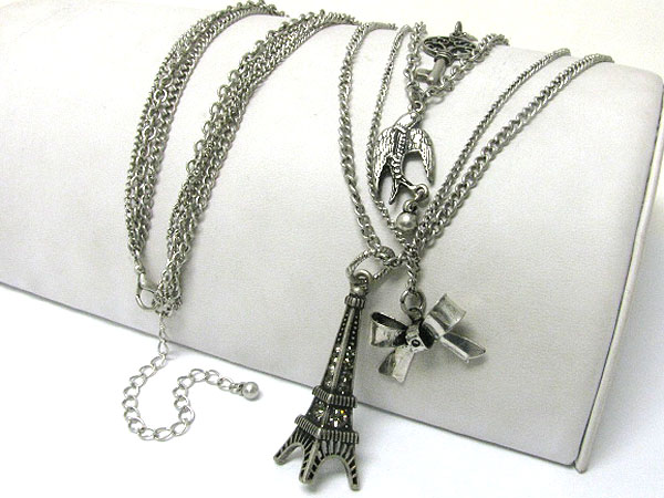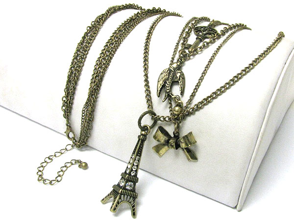 WHOLESALE ELFEL TOWER RIBBON AND KEY DANGLE MULTI LAYER METAL CAHIN LONG NECKLACE 358755