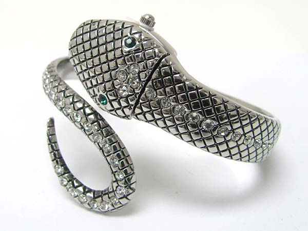 Crystal stud metal hinge bangle watch - watch face in snake head