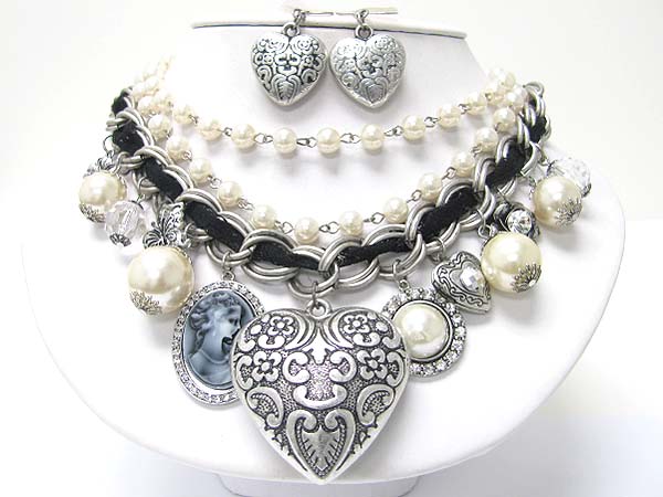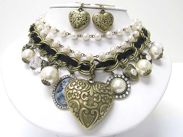 Crystal deco mixed charm and pearl ball dangle multi strand neckalce earring set?