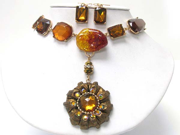 WHOLESALE RESIN GLASS STONE ROUND MEDAL DANGLE NECKLACE EARRING SET 359401