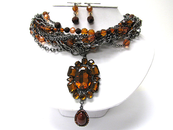 WHOLESALE CRYSTAL DECO OVAL PENDANT AND MULTI BRAIDED CHAIN NECKLACE EARRING SET 359549