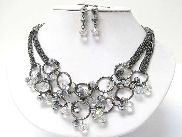 Facet glass stone dangle metal ring and chain link necklace earring set