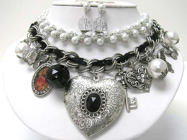 WHOLESALE METAL FILIGREE HEART LOCKET AND MIXED ANTIQUE METAL CHARM DANGLE PEARL AND MULTI CHAIN NECKLACE EARRING SET 360356