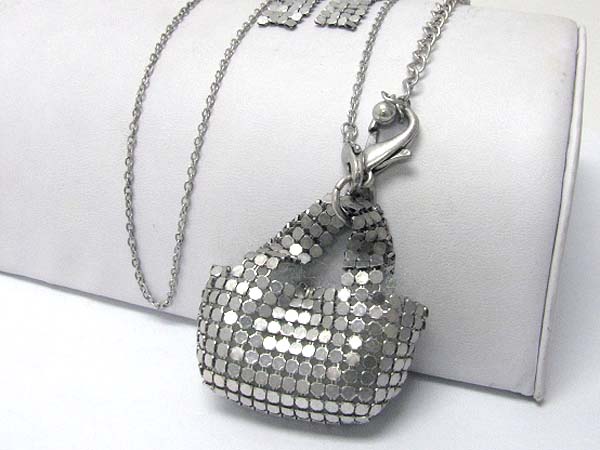 Burnish metal round mesh handbag pendant long necklace earring set