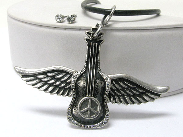 WHOLESALE CRYSTAL STUD FLYING ROCK GUITAR PENDANT AND CORD NECKLACE EARRING SET 360620