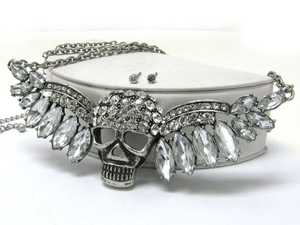 Large crystal stud feather wing skull tied necklace earring set