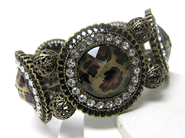 Animal glass and crystal deco filigree metal round disk stretch bracelet