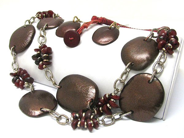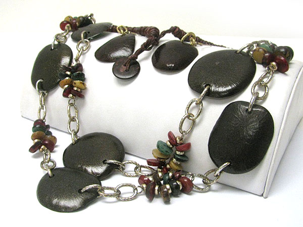 Eco friendly wooden nugget and metal cahin link long necklace earring set