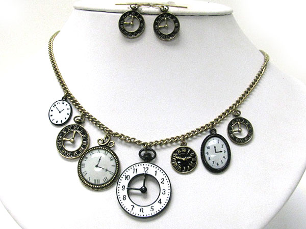 WHOLESALE MULTI ANTIQUE CLOCK SHAPE CHARM DANGLE NECKLACE EARRING SET 361068