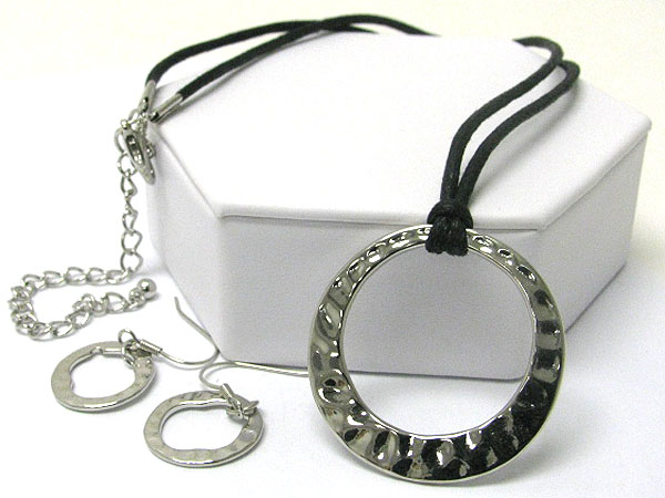 WHOLESALE HAMMERED METAL CIRCLE AND CORD TIED NECKLACE EARRING SET 361191