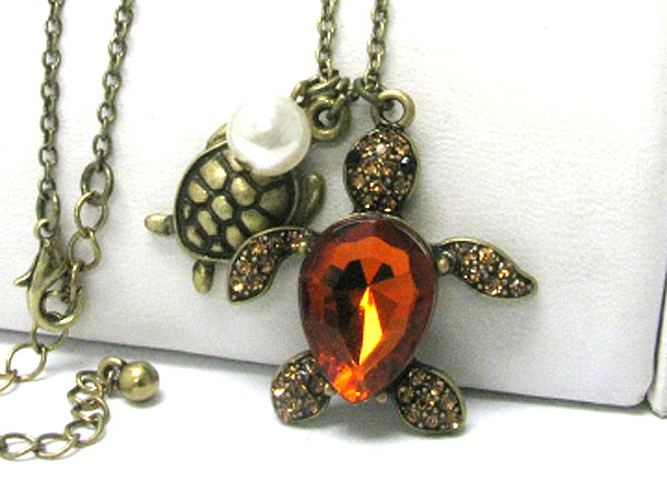 Crystal stud burnish metal dual turtle charm dangle long necklace