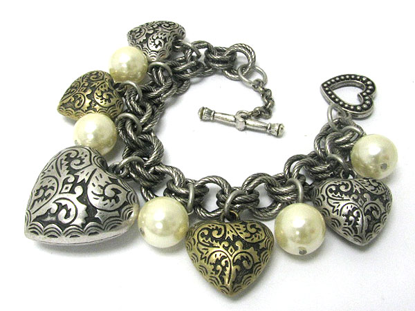 WHOLESALE TEXTURED METAL HEART CHARM AND PEARL BALL DANGLE BRACELET 361255